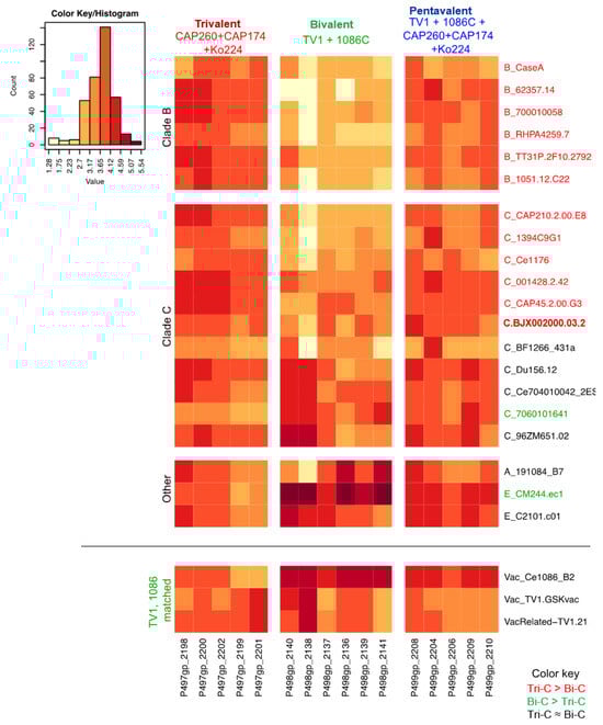 Heatmap of binding magnitude (EC50) for V1V2 gp70 scaffolds by guinea pigs in the 3 vaccine groups. V1V2 antigens in red showed higher binding (p < 0.05, two-tailed Wilcoxon rank sum test) by the trivalent group compared to the bivalent group, and green indicated higher binding by the bivalent group compared to the trivalent group. Antigens are ordered by subtypes. Antigens above the horizontal line are heterologous strains, and the ones below the line are vaccine-matched strains.