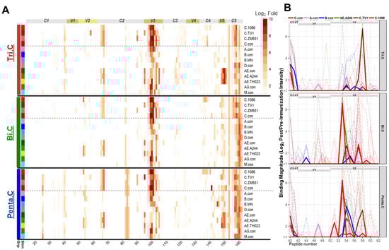 An NHP study comparing bivalent subtypes BE versus pentavalent subtypes BEEE boosts reported that the inclusion of additional diverse gp120 immunogens to a pox-prime/protein boost regimen can augment antibody responses and enhance protection against a simian–human immunodeficiency virus (SHIV) challenge []. A study using V1V2-scaffold proteins further showed the advantage of multivalent V1V2 immunization in improving heterologous V1V2-specific responses compared to monovalent immunizations []. We hypothesized that the great diversity of subtype C Env necessitated an immunogen design with the capacity for eliciting more diverse V1V2 responses. Considering the importance of the potentially protective V1V2 immune correlates in the RV144 Thai trial, we aimed to improve the breadth of vaccine-elicited responses against SA subtype C strains by including natural Env variants that were computationally selected to enhance the V1V2-region coverage of P5 subtype C vaccine strains already in use, 1086C and TV1. The three novel subtype C Env strains we chose were tested as a trivalent combination in guinea pigs, side by side with the 1086C and TV1 bivalent regimen and pentavalent regimen that included all five subtype C strains. We evaluated the breadth of binding responses to both V1V2 scaffolded proteins and V2 linear epitopes, and both in terms of subtype/strain coverage and epitope coverage.