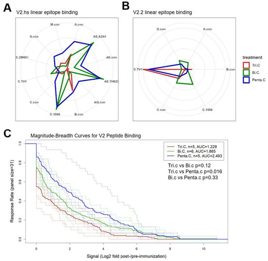Spider plots showing the coverage Env strains for the two V2 linear epitopes by the 3 groups of guinea pigs (A,B), and the magnitude–breadth curves for binding to V2 linear peptides for the 3 vaccine groups. For the spider plots (A,B), labeled around each spider plot are the Env strains that showed responses for the respective epitope. The magnitude of binding to each epitope is the highest binding signal (Log2 fold post-/pre-immunization) to a single peptide within the epitope region for the strain. The epitope region covers peptide #53–54 for V2.hostpot, and peptide #57–58 for V2.2. Plotted are the group median magnitude values. For the magnitude–breadth curve plot (C), each curve is plotted as the proportion of linear V2 peptides (shown in Figure S5) that the animal responded to with a magnitude (Log2 fold post-/pre-immunization) within the interval indicated on the x-axis. Thin dotted lines represent individual animals, and thick solid lines represent the group median values.