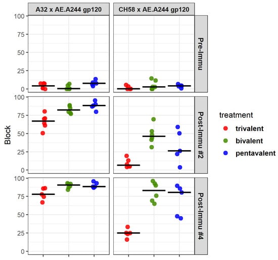 The ability of the trivalent, bivalent, and pentavalent subtype C vaccines to elicit antibody specificities that block the binding of an ADCC-mediating antibody A32 and a V2 linear epitope binding antibody CH58 to Env was evaluated. The bivalent group showed a slightly higher level of blocking activity against A32 binding (1.2-fold difference, p = 0.018 post immunization #4, Wilcoxon rank sum test) but a substantially higher level of blocking activity against CH58 binding (3.3-fold difference, p = 0.0062) compared to the trivalent group (Figure 6; Table 4). Meanwhile, the pentavalent group showed similar levels (p > 0.05) of blocking activity compared to the bivalent group against both monoclonal antibodies (mAbs), and a higher level of blocking than the trivalent group (p = 0.009 post immunization #4, Wilcoxon rank sum test). Therefore, the bivalent and the pentavalent groups showed advantages over the trivalent group in eliciting antibody specificities that target CH58 and, to a lesser degree, A32 binding sites.