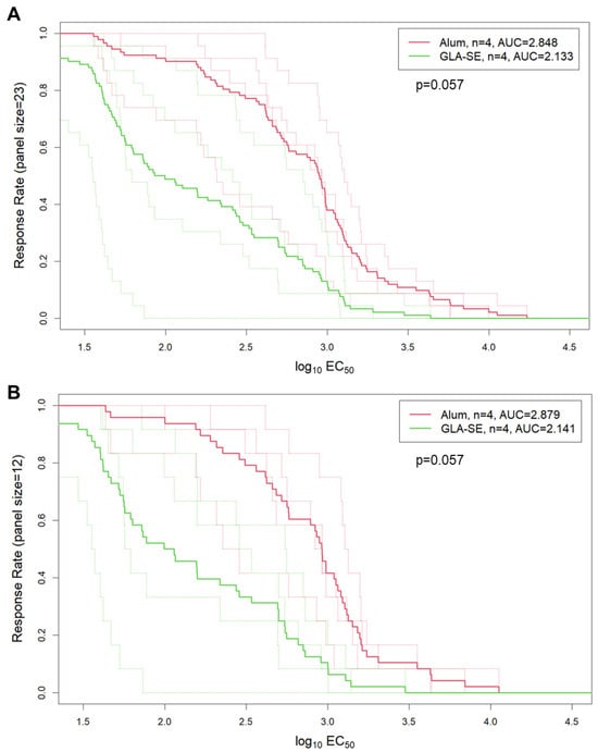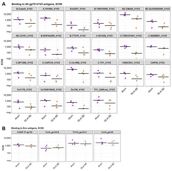 BAMA data for serum samples from 2 weeks post the last immunization showed that all four macaques in the alum group developed V1V2-specific responses against all 22 cross-subtype V1V2 scaffolds in the assay (Figure 7A). Meanwhile, the four macaques in the GLA-SE group also developed positive responses against 16 out of the 22 V1V2 scaffolds. Interestingly, even though the overall binding magnitudes to the gp120 and gp140 Env proteins tested were similar between the two study groups (Figure 7B), the alum group showed a consistent trend of a higher magnitude of binding to V1V2 scaffolds and Tags compared to the GLA-SE group (p < 0.05 for seven out of twenty-seven V1V2 analytes) (Figure 7A; Table S1A). The magnitude–breadth of binding to V1V2 scaffolds trended higher for the alum group compared to the GLA-SE group (Figure 8).