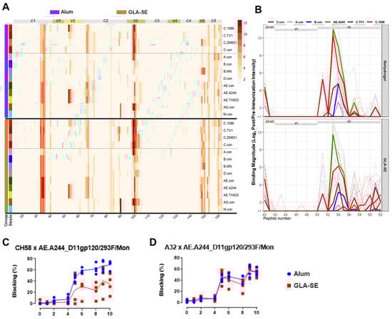 In addition, the ability of vaccine-elicited serum antibodies to block CH58 and A32 binding to the AE.A244 gp120 protein was measured using longitudinal serum samples. The blocking data revealed that macaques in the alum group developed a higher magnitude of antibody response that blocks CH58 binding compared to the GLA-SE group (p = 0.03; Table S1B), whereas the ability to block A32 binding is comparable between the two groups (Figure 9C,D). This is consistent with BAMA data showing comparable binding to gp120 proteins but higher levels of binding to most V1V2 constructs by the alum group compared to the GLA-SE group.