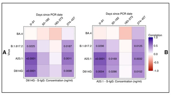 Correlation heat map of neutralizing antibody titers against SARS-CoV-2 variants and spike-directed IgG antibodies. This figure displays heat maps comparing the correlations between neutralizing antibody titers against SARS-CoV-2 variants D614G, A.23.1, Delta, and BA.4 and spike-directed IgG antibody levels for D614G (A) and A.23.1 (B). Positive correlations are indicated in purple, while negative correlations are shown in red. Statistical significance was determined at a threshold of p ≤ 0.05; p-values are indicated in the heatmap.
