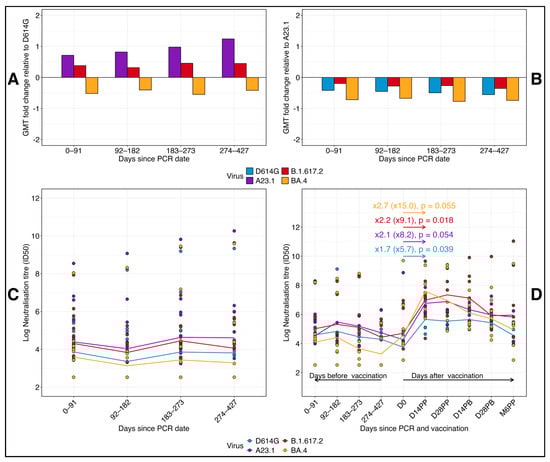 We performed a comparative analysis of geometric mean titer (GMT) fold changes relative to D614G and A.23.1 across all time points, as well as neutralizing titers for 13 reinfected subjects and pre- and post-vaccination titers in 8 ChAdOx1-S-vaccinated participants (Figure 5). At each time point, fold changes in neutralizing titers were calculated for each virus variant relative to D614G (Figure 5A) and A.23.1 (Figure 5B). A fold change greater than 0 indicated an increase in neutralizing titers, while a fold change below 0 represented a decrease. A fold change of 0 implied no change in titers. When neutralizing titers were compared to D614G, Delta exhibited a marginal increase across all time points, indicating a slight enhancement in the neutralizing response. Over time, A.23.1 demonstrated a gradual fold increase in neutralizing titers compared to D614G, signifying consistently higher titers for A.23.1. In contrast, BA.4 showed a consistent fold decrease relative to D614G, indicating lower neutralizing antibody responses for BA.4 at all time points.