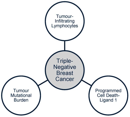 Immunotherapy offers promise in customising TNBC therapies, particularly in relation to the distinct features of the tumour microenvironment. Compared to other breast cancer subtypes, TNBC exhibits higher levels of tumour-infiltrating lymphocytes (TILs), programmed cell death-ligand 1 (PD-L1) expression, and increased tumour mutational burden (TMB) [13] (refer to Figure 1).