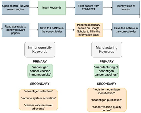 Literature search process and primary and secondary keywords. This method was used to perform a systematic literature review in “Immunogenicity of Neoantigens” and “Proposed Manufacturing of Neoantigen Cancer Vaccines”.