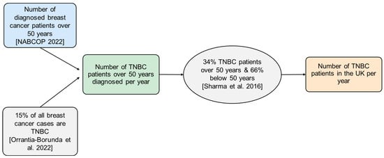 Method for the calculation of annual TNBC patients diagnosed in the UK. Assumptions outlined in the figure were used to calculate the total annual number of TNBC patients [4,34,35].