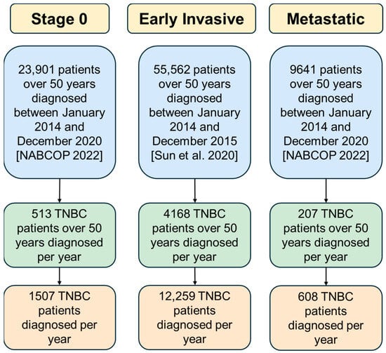 Annual distribution of TNBC patients per cancer stage. The calculation method is applied from Figure 3. The numbers of patients per breast cancer stage were directly derived from the cited sources [35,36]. Stage 0 and metastatic stage patients were adjusted to an annual number of new breast cancer stages, and the values were further adjusted to extract the TNBC proportion of patients. The final number accounted for TNBC patients below 50 years since the primary data did not contain these patients. Notably, the data used to quantify patients in the early-invasive subgroup are limited to the year 2015, compared to more recent data available to quantify patients in stage 0 and metastatic subgroups. This implies a limited degree of accuracy of the estimated numbers.