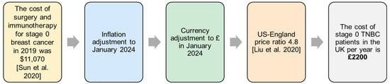 Method for calculating the cost per stage 0 TNBC patient in the UK. This approach was taken due to a lack of stage 0 therapy cost information in the UK [36,37].