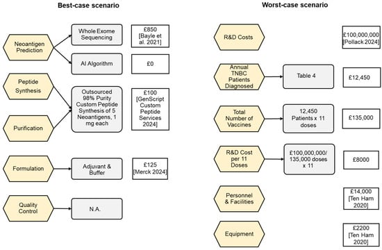 The principal aim of this review is to analyse the physiological properties and the proposed manufacturing process of a peptide-based neoantigen cancer vaccine (NCV) for TNBC, identify the direct medical costs of TNBC treatments, and project two NCV pricing schemes using the UK as a model healthcare system. Our analysis shows that the potential clinical adoption of an NCV for TNBC is highly contingent upon the successful identification of key neoantigens and the definitive pricing model brought forward. We propose a multi-neoantigen setting with a TLR agonist that ought to be investigated for TNBC. Combination therapies may result in an opportunity to lower the current high TNBC therapy costs by leveraging the positive financial impact that an NCV could bring by enhancing clinical outcomes under such a therapeutic framework.