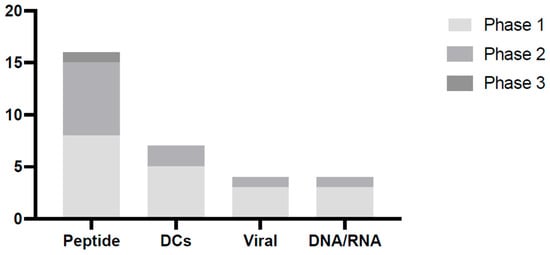 Breakdown of TNBC cancer vaccine platforms. The analysis demonstrates the significant industry interest in peptide-based cancer vaccines. The data are detailed in Table A1. Created from clinicaltrials.gov.