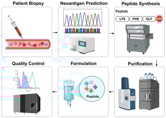 The proposed manufacturing process of an NCV. The process begins with obtaining a patient sample to predict immunogenic neoantigens and the arrows show the subsequent steps. The first step can utilise next-generation sequencing (NGS) tools, including whole exome sequencing, and validate the results by HLA typing, peptide processing, and peptide-MHC binding prediction. Next, the identified neoantigens synthesis will be outsourced to protein synthesising companies, significantly driving the low-cost dynamics of the process. The peptide purification will be outsourced as well, and the neoantigens will be delivered with 98% purity [47]. The proposed formulation of an NCV is an intravenous injection to stimulate a strong anti-tumour response. The quality control (QC) for an NCV will determine safety, immunogenicity, and efficacy by performing immunogenic assays and analysing adverse events and standard oncology endpoints. Created with Biorender.