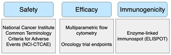 Industry-standard quality controls (QCs) for NCVs include safety, immunogenicity, and efficacy (Figure 10). Both trials employ the National Cancer Institute Common Terminology Criteria for Adverse Events (NCI-CTCAE) to assess safety, while efficacy and immunogenicity are evaluated using enzyme-linked immunospot (ELISPOT) analyses, multiparametric flow cytometry, and standard oncology trial endpoints, such as the clinical response rate and overall survival [84,85]. ELISPOT assays objectively assess NCV immunogenicity by quantifying the frequency of immune cells producing specific cytokines linked to tumour-specific immune responses, validated for neoantigen-specific T-cell responses in cancer patients [86]. Multiparametric flow cytometry assesses cytokine production and the frequency of neoantigen-specific T-cells, providing a comprehensive view of the cancer vaccine efficacy [87]. The clinical response rate indicates the proportion of patients with tumour shrinkage or disappearance, reflecting vaccine efficacy, while overall survival directly reflects the vaccine’s impact on patients’ lives [88]. Thus, the analysis of the two NCV trials justifies current QC practices, providing authentic assessments of NCV safety, efficacy, and immunogenicity.