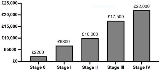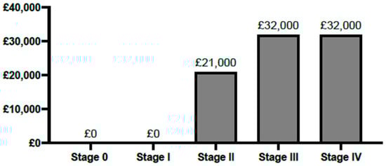 The costs vary significantly across different disease progression stages, as shown in Figure 13, with notable escalations in advanced disease stages. Stage 0 and I TNBC patients typically undergo surgery, with additional chemotherapy and radiotherapy for stage I. Moreover, the shorter therapy cycles also contribute to lower associated costs [36]. Costs markedly escalate from stage II onwards due to the inclusion of ICIs, although not all patients meet the eligibility criteria for these therapies. According to the assumptions in this paper, nearly two-thirds of patients do not express PD-L1, thus receiving only conventional treatment. However, the per-patient costs shown in Figure 13 (ranging from GBP 2200 to GBP 54,000) represent the maximum potential costs per stage, including ICIs. Interestingly, costs between stages III and IV are relatively comparable (GBP 49,500 and GBP 54,000). While stage IV TNBC patients have a median survival time of 13 months, the reported overall survival time for stage III patients is 92 months [10,91]. Therefore, the substantial costs of stage IV therapy and the reduced quality of life resulting from chemotherapy may contribute to the low therapy uptake, with only 25% of stage IV patients receiving any form of treatment, as shown in Table 3 [35].