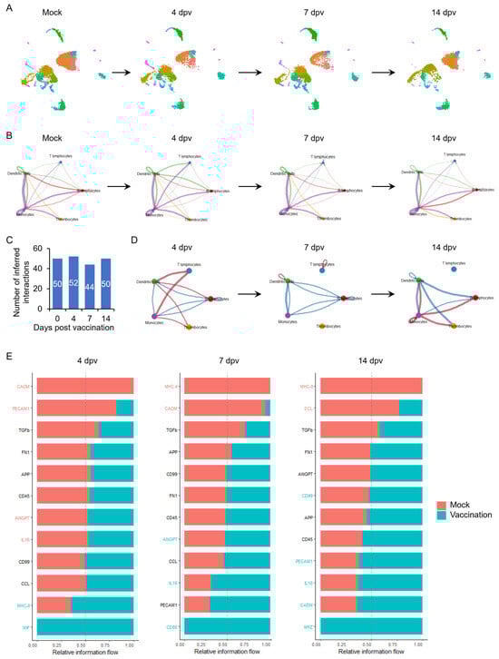 Figure 2. Dynamic PBMC landscapes and overview of cell–cell communication network upon vaccination. (A) Transition of chicken PBMC composition upon vaccination. (B) The dynamic cell–cell communication network upon vaccination was inferred using CellChat (version 1.4.0). Circle plots presenting the network centrality analysis of the signaling pathways transduced among PBMCs within two weeks post-vaccination. Different colors represent different cell types, and edge width is proportional to the communication probability. Arrows and edge color indicate direction (source: target). (C) The numbers of inferred interactions at indicated days post-vaccination were summarized. (D) Comparison of the cell–cell communication of PBMCs post-vaccination with those at the onset of vaccination is presented with circle plots. Different colors represent different cell types, and edge width is proportional to the communication probability. Arrows indicate direction (source: target). Edge color: red indicates promotion, and blue indicates reduction. (E) Signaling in red font indicates more enrichment in the mock group, while signaling in blue font indicates more enrichment in the vaccination group. Signaling equally enriched in both groups is colored black. dpv: days post-vaccination.