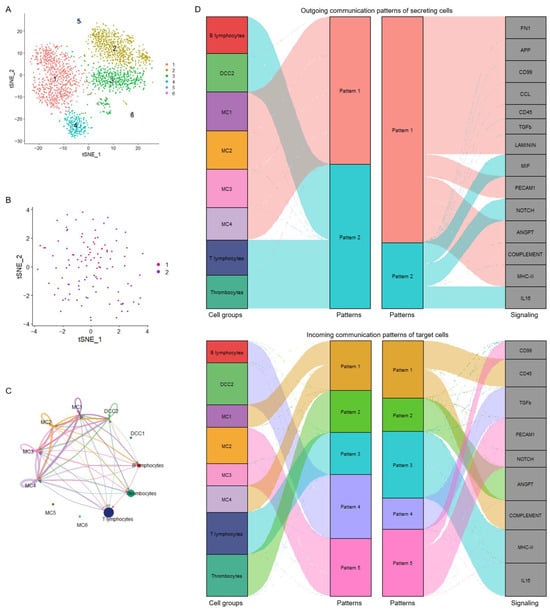 Figure 4. Global intercellular communication of major APCs during the initiation of antiviral adaptive immune response. (A) t-distributed stochastic neighbor embedding (t-SNE) clustering of chicken monocytes. Each subcluster of monocytes is labelled by different colors. (B) t-SNE clustering of chicken dendritic cells. Each subcluster of dendritic cells is labelled by different colors. (C) Circle plots presenting the overall cell–cell communication network among each subcluster of APCs and other PBMCs. Different colors represent different cell types, and edge width is proportional to the communication probability. Arrows and edge color indicate direction (source: target). (D) The deduced communication patterns of secreting cells and the reception patterns of target cells illustrate the relationship between the inferred latent patterns and cell groups, along with the signaling pathways. The flow’s thickness represents the extent of contribution from each cell group or signaling pathway to the latent pattern.