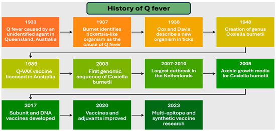 However, reactogenicity in pre-sensitized individuals necessitated screening protocols, limiting global implementation [32]. Recent advances in genomic and immunologic technologies have enabled the development of innovative vaccine approaches. These include subunit vaccines targeting specific bacterial antigens, DNA-based platforms, and multi-epitope designs integrating multiple antigenic determinants [19,33]. By 2017, researchers had developed platforms specifically addressing reactogenicity through targeted antigen selection [29,34], while subsequent work focused on optimizing formulations and adjuvants [35,36]. This comprehensive review examines the evolution of Q fever vaccine development through an analysis of pathogen characteristics, host immune responses, and emerging technologies [37,38]. Our examination provides insights into rational design strategies for next-generation vaccines, addressing the continuing challenge of achieving widespread immunity while maintaining safety and efficacy. Summarizing the milestones Figure 1 gives a timeline of the history of Q fever research and vaccine development, highlighting scientific discoveries, technological advances, and public health interventions.