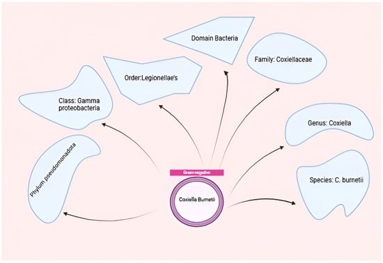 Coxiella burnetii, the etiological agent of Q fever, is an obligate intracellular pathogen that exhibits remarkable adaptability to diverse environments and host cells [14]. This small, Gram-negative bacterium belongs to the order Legionellales within the Gammaproteobacteria class and is closely related to Legionella pneumophila [39]. The organism demonstrates highly successful adaptation to intracellular growth, requiring specific conditions including an acidic pH (~4.75) for optimal replication within host cells [40,41]. Coxiella burnetii, belonging to the order Legionellales and the family Coxiel-laceae, is a small obligate intracellular gram-negative bacterium that causes Q-fever in humans and coxiellosis in wild and domestic animals Figure 2.