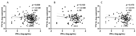 Figure 6. Correlation between pre-vaccine TTV VL and post-vaccination IFN-γ levels in HP: overall (A), after second dose (B), and after third dose (C).