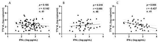 Among PLWHs, 77 out of 90 (85.6%) showed a positive IFN-γ response after the second vaccination, with a median level of 210.9 pg/mL (IQR 80.3–436.9). Similarly, after the third vaccine dose, 137 out of 153 patients (89.5%) showed a positive response, with a median IFN-γ level of 283.8 pg/mL (IQR 124.2–533.1). Figure 5 shows the significant inverse correlations observed between pre-vaccine TTV VL and IFN-γ levels measured overall, after the second and after third doses of vaccine. This significant correlation is not evident when the values are considered separately (Figure 5B,C).