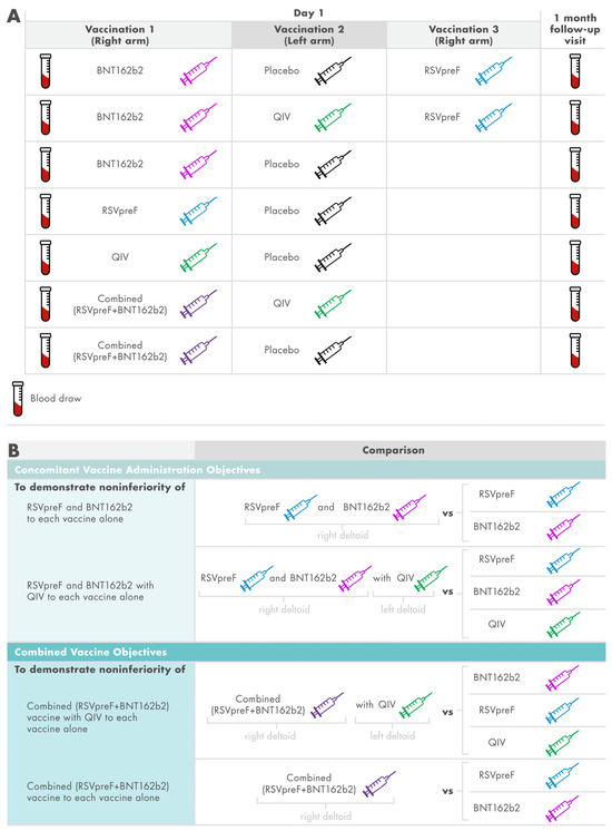 Neutel, J.M.; Erdem, R.; Jiang, Q.; Cannon, K.; Stacey, H.; Newton, R.; Gomme, E.; Li, W.; Mensa, F.J.; Türeci, Ö.; et al. Safety and Immunogenicity of Concomitant Administration and Combined Administration of Bivalent BNT162b2 COVID-19 Vaccine and Bivalent RSVpreF Respiratory Syncytial Virus Vaccine with or Without Quadrivalent Influenza Vaccine in Adults ≥ 65 Years of Age. Vaccines 2025, 13, 158. https://doi.org/10.3390/vaccines13020158