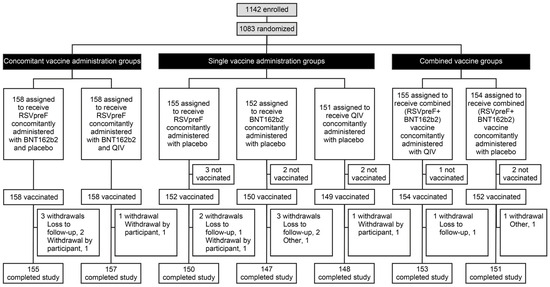 - Falsey, A.R.; Walsh, E.E.; Scott, D.A.; Gurtman, A.; Zareba, A.; Jansen, K.U.; Gruber, W.C.; Dormitzer, P.R.; Swanson, K.A.; Jiang, Q.; et al. Phase 1/2 randomized study of the immunogenicity, safety, and tolerability of a respiratory syncytial virus prefusion F vaccine in adults with concomitant inactivated influenza vaccine. J. Infect. Dis. 2022, 225, 2056–2066. [Google Scholar] [CrossRef]