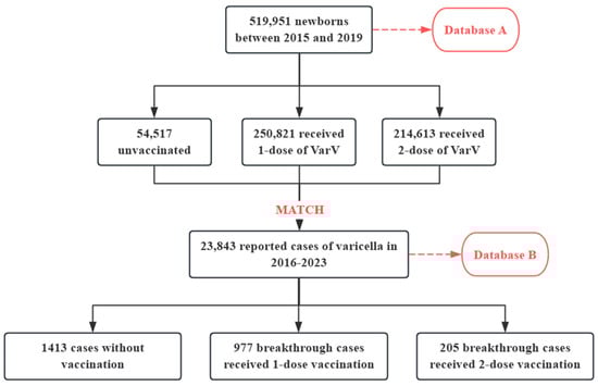 Data on a total of 519,951 newborns in the Pudong New Area of Shanghai, born between 2015 and 2019, including demographic information and VarV vaccination information, were obtained from the Shanghai Immunization Information System, referred to as “Database A”. Within Database A, 54,517 children did not have varicella vaccination, 250,821 children had received 1-dose of VarV and 214,613 had received 2-dose of VarV. Additionally, 23,843 cases of varicella with onset dates ranging from 2016 to 2023 were obtained through the China Information System for Disease Control and Prevention, referred to as “Database B”. After matching Database A and B based on name, gender and date of birth, a total of 1182 breakthrough varicella cases were obtained, of which 977 cases received one dose of VarV, while 205 cases received two doses of VarV (Figure 1).