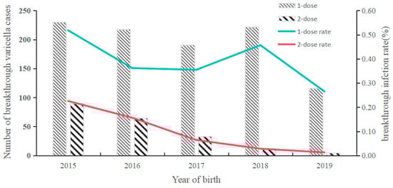 The number of breakthrough varicella cases and breakthrough infection rate among different years of birth.