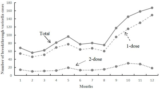 The incidence of breakthrough varicella cases among children born between 2015 and 2019 varied monthly, with reported cases ranging from 56 to 167. Specifically, the number of breakthrough cases among those who received one dose ranged from 46 to 149, while those who received two doses ranged from 10 to 30. The proportion of breakthrough cases for 1-dose and 2-dose recipients from September to December was 50.05% and 47.80%, respectively (Figure 3).