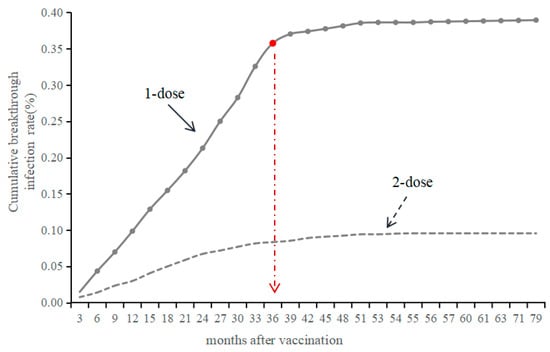 The longest interval observed between vaccination and the onset of 1182 breakthrough varicella cases was 80.49 months, while the shortest interval was 1.49 months, with a median duration of 22.70 months. For breakthrough varicella cases following 1-dose and 2-dose vaccinations, the intervals between vaccination and onset were recorded as 1.49 to 80.49 months and 1.56 to 56.69 months, respectively. The median intervals were 23.79 months and 18.35 months. The cumulative breakthrough infection rate in 1-dose vaccination increased rapidly to 0.36 within the first 36 months, followed by a gradual increase. In contrast, the 2-dose group exhibited a slow increase to 0.08 within 36 months, after which it stabilized (Figure 4).