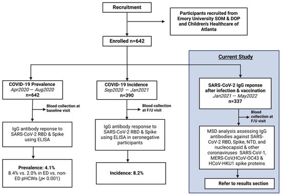 Study Flow Diagram: Overall study procedures across the three different stages of analysis of COVID-19 epidemiology in a cohort of pediatric healthcare workers. From April 2020 to August 2020, 642 pHCWs were assessed at baseline for IgG antibody response to SARS-CoV-2 RBD and spike utilizing ELISA, showing a prevalence of 4.1% that was significantly higher in emergency department pHCWs. From September 2020 to January 2021, 390 seronegative pHCWs returning for at least 1 follow-up (F/U) visit were assessed for incidence of new seropositivity using ELISA, showing a new incidence of 8.2%. The current study was conducted from January 2021 to May 2022, enrolling 337 participants from the original cohort who returned for at least one follow-up visit post-vaccination availability, conducting MSD analysis assessing antibodies against SARS-CoV-2 antigens and other coronaviruses.