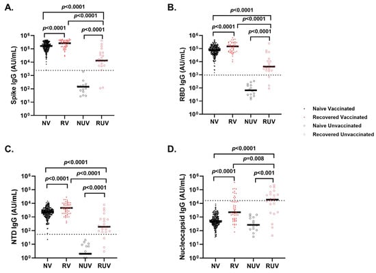 Antibody response to SARS-CoV-2 antigens across different subgroups of pediatric healthcare workers. IgG antibody response at first follow-up visit in Naïve Vaccinated (NV, vaccinated subjects without prior COVID-19 infection; closed black circle), Recovered Vaccinated (RV; those who recovered from prior COVID-19 infection; closed red circle), Naïve Unvaccinated (NUV; unvaccinated subjects never infected; open black circle) and Recovered Unvaccinated (RUV; unvaccinated subjects who have recovered from a prior COVID-19 infection; open red circle) against (A) Spike, (B) Receptor-Binding Domain (RBD), (C) N-terminal Domain (NTD), (D) Nucleocapsid. Vaccinated individuals show robust antibody binding titers for (A) RBD, (B) Spike, and (C) NTD compared to unvaccinated subjects. Recovered individuals show higher IgG antibody titers for (A) RBD, (B) Spike, and (C) NTD compared to naïve individuals regardless of vaccination status. (D) COVID-19-recovered subjects demonstrate higher nucleocapsid IgG antibody titers compared to naïve individuals irrespective of vaccination status. Nucleocapsid is a marker of infection; however, sampling post-infection was variable, and nucleocapsid titers dropped quickly. The dotted line in each figure corresponds to the specific cut-off value for each antibody. (A) Spike IgG = 2408 AU/mL; (B) RBD IgG = 962 AU/mL; (C) NTD = 53 AU/mL; (D) Nucleocapsid = 15,893 AU/mL.