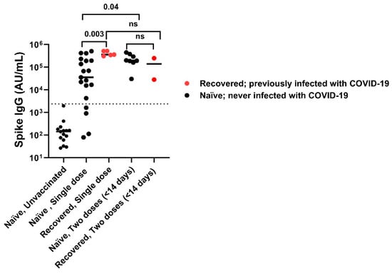 SARS-CoV-2 spike IgG titers with one dose versus two doses of vaccine. A single dose of vaccine is sufficient to attain maximum titers in recovered subjects compared to naïve subjects, while some naïve subjects required 2 doses of vaccination to attain maximum titer. After 2nd vaccination dose both naïve and recovered individuals achieved high Spike IgG antibody titers irrespective of infection. The dotted line corresponds to the cut-off value determined for spike IgG = 2408 AU/mL. ns: not significant.
