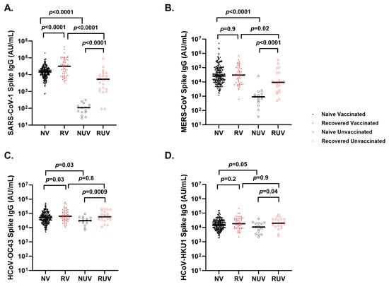 Spike IgG titers to seasonal and other coronaviruses in different subgroups of pediatric healthcare workers. Spike IgG antibody response at first follow-up visit in Naïve Vaccinated (NV, vaccinated subjects without prior COVID-19 infection; closed black circle), Recovered Vaccinated (RV; those who recovered from prior COVID-19 infection; closed red circle), Naïve Unvaccinated (NUV; unvaccinated subjects never infected; open black circle), and Recovered Unvaccinated (RUV; unvaccinated subjects who have recovered from a prior COVID-19 infection; closed red circle) against (A) SARS-CoV-1, (B) MERS-CoV, (C) HCoV-OC43, and (D) HCoV-HKU1. Vaccinated subjects show robust IgG titers for (A) SARS-CoV-1, and (B) MERS-CoV versus unvaccinated subjects. Recovered individuals had higher titers for (A) SARS-CoV-1 compared to naïve individuals regardless of vaccination status. (C) Spike IgG titers against HCoV-OC43 show a significant difference between naïve and recovered regardless of vaccination. (D) Spike IgG titers against HCoV-HKU1 differed between RUV and NUV (p = 0.04), as well as NV and NUV (p = 0.05).
