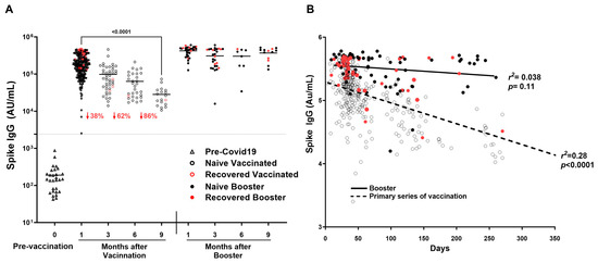 Durability of SARS-CoV-2 IgG antibodies over time after COVID-19 primary vaccination and booster. SARS-CoV-2 IgG antibody response was studied in naïve vaccinated (open black circle) and recovered vaccinated (open red circles) subjects at 1, 3, 6, and 9 months after the COVID-19 primary vaccination series (2 doses) and in booster recovered (subjects with breakthrough COVID-19 infection after receiving primary vaccine series and the COVID-19 booster) (red filled circle) and naïve booster subjects (never infected with COVID-19) (black filled circle) at 3, 6, and 9 months after COVID-19 booster. (A) Mean Spike IgG antibody titer to COVID-19 decreased by 86% by nine months after the primary series of COVID-19 vaccination, while Spike IgG antibody titers to COVID-19 showed sustained titer levels nine months after the COVID-19 booster. (B) A significant decline of Spike IgG antibody titer associated with an increase in time in days is observed in subjects after the COVID-19 primary series of vaccination (r2 = 0.28, p < 0.0001) absent in subjects receiving the COVID-19 booster (r2 = 0.038, p = 0.11). The dotted line corresponds to the cut-off value determined for spike IgG = 2408 AU/mL.