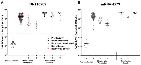SARS-CoV-2 anti-spike IgG titers after mRNA-1273 and BNT162b2 vaccination and breakthrough infection. SARS-CoV-2 IgG antibody response was studied in naïve vaccinated (open black circle) and in recovered vaccinated (open red circle) subjects at 3, 6, and 9 months after the COVID-19 primary vaccination series and in naïve booster subjects (never infected with COVID-19; black filled circle) and booster recovered (subjects with breakthrough COVID-19 infection after receiving two doses of the primary COVID-19 vaccine and the COVID-19 booster; red filled circle) at 3, 6, and 9 months after COVID-19 booster who received (A) BNT162b2 and (B) mRNA-1273 vaccines. Breakthrough infection with COVID-19 was higher in subjects receiving the (A) BNT162b2 (n = 17 out of 203 vaccinations) as compared to subjects receiving the (B) mRNA-1273 vaccine (n = 4 out of 97 vaccinations), this was not statistically significant. The dotted line corresponds to the specific limit of detection for spike IgG = 2408 AU/mL.