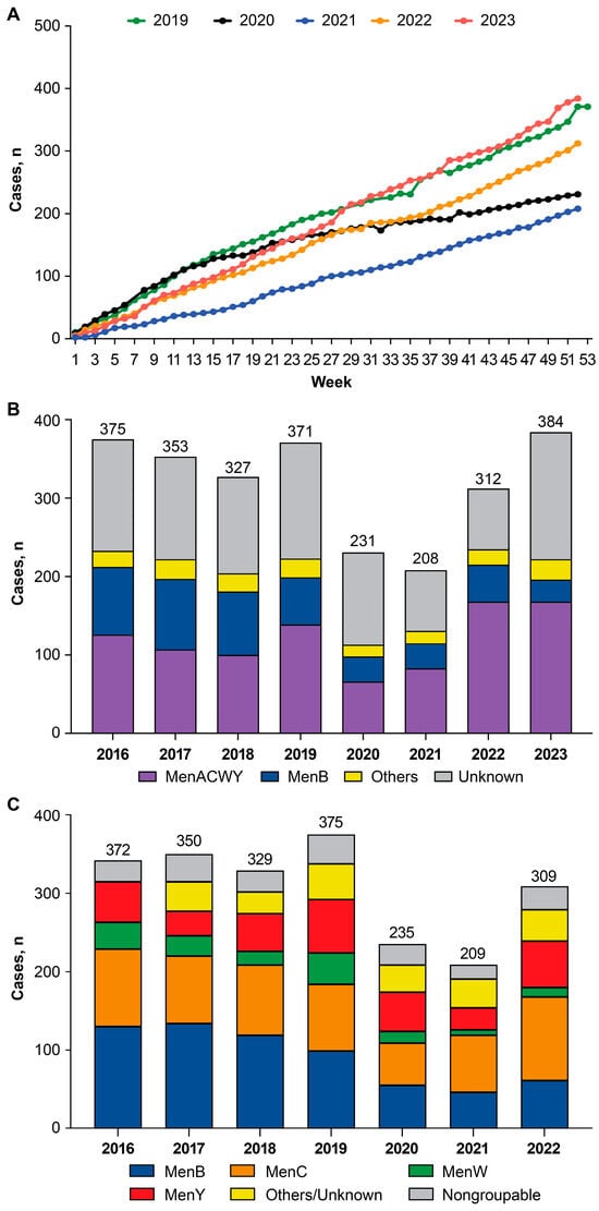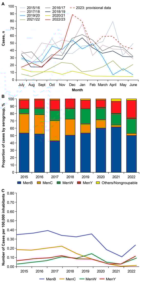 Yearly cases of invasive meningococcal disease by month (A), by proportion of each serogroup (B), and incidence by serogroup (C) in France: 2015–2023 [22].