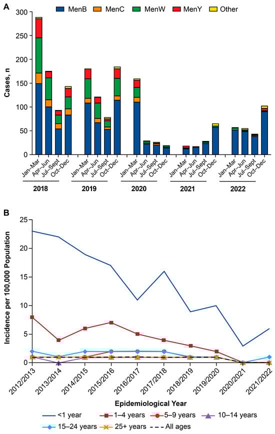 Quarterly invasive meningococcal disease case numbers by serogroup (A) and yearly incidence by age group (B) in England: 2018–2022 ([43,44,45,46,47,48,49,50,51,52,53,74,75]; contains public sector information licensed under the Open Government License v3.0). MenB, MenC, MenW, and MenY, meningococcal serogroups B, C, W, and Y, respectively; Other, serogroups A, X, E, Z, or ungroupable and ungrouped serogroups.