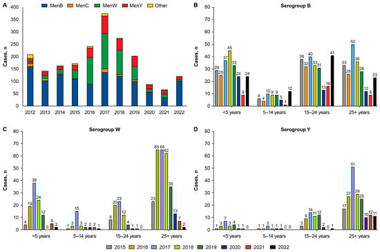 Annual invasive meningococcal disease case numbers by serogroup (A) and age (B–D) in Australia through 2022 [23,58,59,60,61,62,63,64,65,66]. MenB, meningococcal serogroup B; MenC, meningococcal serogroup C; MenW, meningococcal serogroup W; MenY, meningococcal serogroup Y; Other, non-BCWY serogroups.