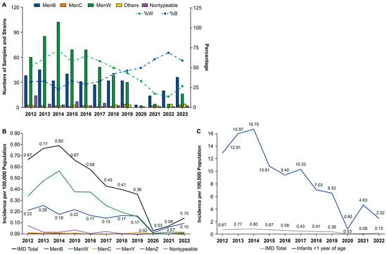 Number of cases (samples and strains) of confirmed IMD (A) and incidence of IMD by serogroup (B) and incidence of IMD in infants <1 year of age (C) in Chile: 2012–2023 [25]. IMD, invasive meningococcal disease; MenB, meningococcal serogroup B; MenC, meningococcal serogroup C; MenW, meningococcal serogroup W; MenY, meningococcal serogroup Y; Others, non-BCWY serogroups.