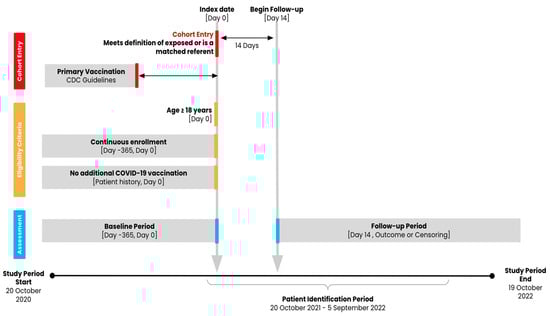 COVID-19-related hospitalization and medically attended COVID-19 were assessed as study outcomes. COVID-19-related hospitalization was defined as any inpatient medical claim or inpatient hospital encounter where any medically attended COVID-19 began in the 21 days prior to the start of the hospitalization and lasted until the final day of hospitalization. Medically attended COVID-19 was defined as a positive COVID-19 diagnostic test (NAAT) or any medical claim, inpatient hospital encounter, or outpatient hospital encounter indicating a diagnosis of COVID-19 (ICD-10-CM code: U07.1). Follow-up began 14 days after the index date and ended at the receipt of any additional COVID-19 vaccine after index, death, loss to follow-up/disenrollment from the insurance plan, the end of the study period (19 October 2022), or the occurrence of the outcome of interest during the follow-up period.