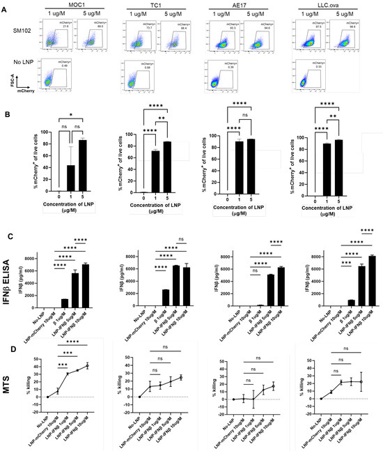 LNPs successfully deliver mRNA transcripts to cancer cells in vitro. Four murine cancer lines were cultured with media containing two doses of mCherry-LNPs for 24 h. Cells were then harvested and evaluated using flow cytometry; representative flow cytometry tracings are provided (A) and summary statistics are displayed (B). The same cancer lines were cultured with media containing 3 doses of IFNβ-LNPs for 24 h. Supernatants were collected and analyzed by IFNβ ELISA (C). The toxicity of IFNβ-LNP was evaluated by assessing viability using a standard MTS Assay (D). μg/M (μg of LNP per Million cells), pg/mL (pg of IFN per mL of supernatant), ns-not significant, * p < 0.05, ** p < 0.01, *** p < 0.001, **** p < 0.0001.