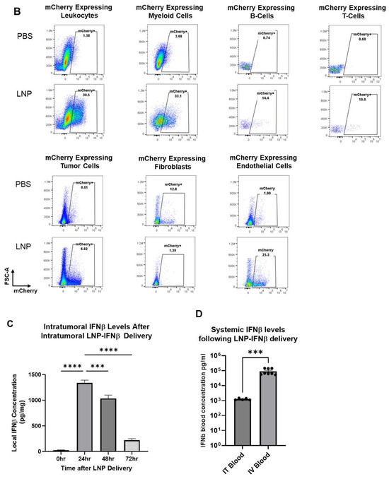 LNPs effectively deliver transcripts to flank tumors. Immunocompetent mice bearing LLC.ova flank tumors were injected intratumorally with 10 μg mCherry-LNPs. After 24 h, tumors were analyzed using flow cytometry to determine which cellular populations had been successfully transfected with LNPs (A). Representative flow cytometry tracings are provided (B). Mice bearing LLC.ova tumors were injected with 10 μg IFNβ-LNPs and tumors were homogenized at designated time points after injection. IFNβ levels were assessed using ELISA and the results are normalized by tumor weight (mg) (C). Systemic INFβ levels were assessed using ELISA 24 h after intratumoral and intravenous injection of PBS or 10 μg of IFNβ-LNPs (D). * IT-Intratumoral, IV-intravenous, pg/mg (pg of IFN per mg of tumor), pg/mL (pg of IFN per mL of blood), ns-not significant, * p < 0.05, ** p < 0.01, *** p < 0.001, **** p < 0.0001 μg/M.