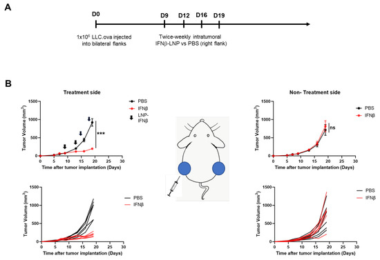 Intratumoral delivery of IFNβ-LNPs inhibits tumor growth in LLC.ova flank tumors. Mice bearing bilateral LLC.oval flank tumors were randomized to biweekly, unilateral injections of PBS or IFNβ-LNPs as depicted (A). Growth of flank tumors on the side of the injected tumors (B, left panels) and non-injected side (B, right panels). Of note, upper growth plots in panel (B) represent the mean (SEM); lower growth plots represent individual tumor growth. PBS-tumors injected with PBS, IFNβ—tumors injected with LNP-IFNβ, *** p < 0.001, arrow notes the time of injection.