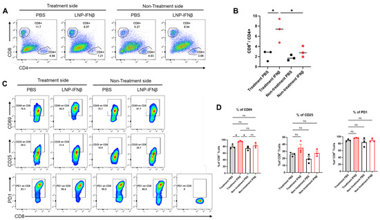 Intratumoral IFNβ-LNPs are associated with quantitative and qualitative changes in tumor-infiltrating CD8 lymphocytes. Within the TME, the percentage of CD8 and CD4 T-cells of all leukocytes was evaluated using flow cytometry. Sample tracings from mice injected with IFNβ-LNPs or PBS, stratified by injected side versus non-injected side, are provided (A). Graph demonstrating the ratio of CD8:CD4 T cells within TME (B). Infiltrating CD8 T-cells were evaluated for several activation markers and sample flow cytometry tracings (CD69, CD25, and PD1) (C), and summary statistics are provided (D). ns-not significant, * p < 0.05.