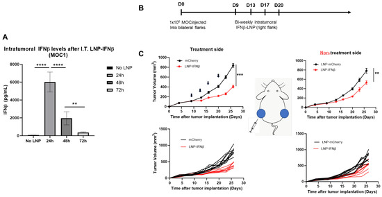 To evaluate the efficacy of INFβ-LNPs in MOC1 tumors, we again established bilateral flank tumors in C57/B6 mice. Once tumors reached approximately 100 mm3 in volume, IFNβ LNPs or mCherry LNPs (10 μg of mRNA) were delivered intratumorally to the right flank tumor. LNPs were delivered bi-weekly for 2 weeks (Figure 6B). In the injected tumors, we appreciated significant decreases in tumor volume after therapy (846 mm3 versus 364 mm3; p < 0.001) (Figure 6C, left panels). However, unlike the LLC.ova flank tumor models, we did observe reductions in tumor volumes on the side contralateral to intra-tumoral injections (790 mm3 versus 550 mm3; p < 0.01), representing an abscopal effect (Figure 6C, right panels).