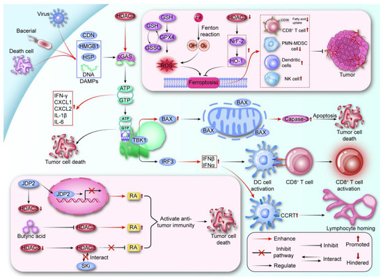 The cGAS-STING pathway is regarded as a central node in the regulation of both innate and intrinsic immunity, with its expression being influenced by HDAC3. As a crucial effector pathway in innate immunity, the cGAS-STING pathway exhibits a bi-directional regulatory role in the immune response. On one hand, it activates downstream pathways through the recognition of intracellular cyclic dinucleotides (CDN) and damage-associated molecules, promoting the release of substantial quantities of IFN-γ, chemokines, and inflammatory factors [79].