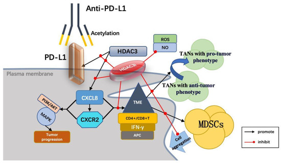 HDAC3 has been shown to regulate the expression of CXCL8. Inhibition of HDAC3 can disrupt the CXCL8/CXCR2 axis, which reduces the infiltration of granulocytic myeloid-derived suppressor cells (G-MDSC) and enhances the activation and infiltration of T cells [150,151]. This alteration improves the tumor immune microenvironment and facilitates the transformation of “cold tumors” into “hot tumors”, thereby enhancing the efficacy of PD-1/PD-L1 checkpoint inhibitors [152]. Consequently, the combination of HDAC3 inhibitors (HDAC3i) and tumor immunotherapy is regarded as a promising new treatment strategy with significant clinical applications and research potential, offering new opportunities to improve the overall prognosis of cancer patients (Figure 3).
