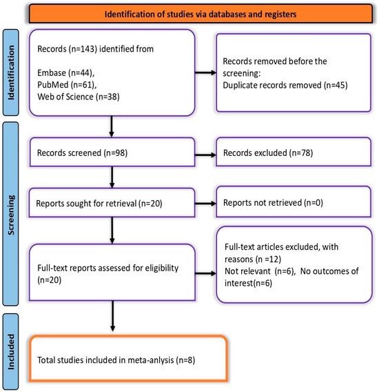 A total of 143 records were identified: 61 from PubMed, 44 from Embase, and 38 from Web of Science, along with two additional records from citation searching. After removing 45 duplicates, 98 records remained for screening. Of these, 78 were excluded during the initial screening, leaving 20 reports for full-text assessment. Twelve were further excluded due to irrelevance. Ultimately, eight studies met all eligibility criteria and were included in the final meta-analysis (Figure 1).