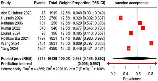 Forest plot illustrating Mpox Vaccine Acceptance among students [13,20,21,22,23,24,25,26].